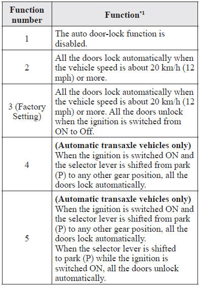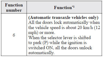 The doors can be set to lock or unlock automatically by selecting any one of the functions from the following table and using the driver's door-lock switch on the interior door panel.