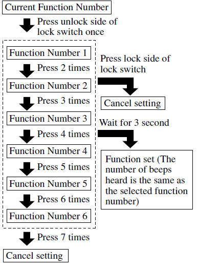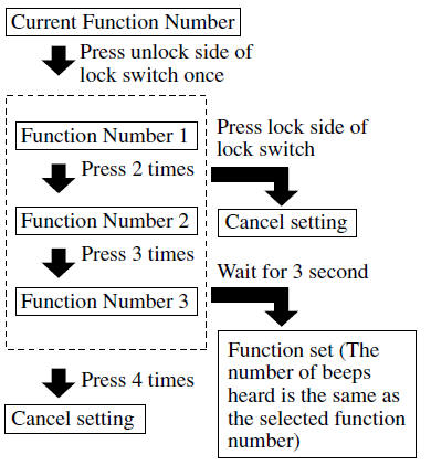 5. Three seconds after the function setting has been changed, a beep sound will beep in the amount of the selected function number. (Ex. Function number 3 = 3 beep sounds)