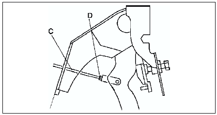 2. Loosen locknut D and turn rod C to align the holes in the fork and in the pedal.