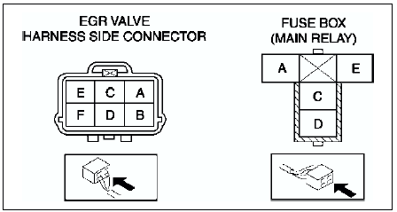 - EGR valve terminal C or D (harness-side) and main relay terminal C (harness-side)