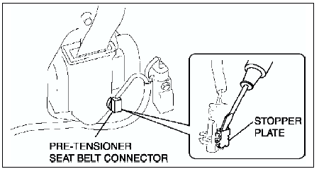 4. Using a screwdriver, pry out the pre-tensioner seat belt connector's stopper plate.