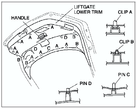 4. Pull the liftgate lower trim toward you, then disengage clips A, B and pins C, D from the body.