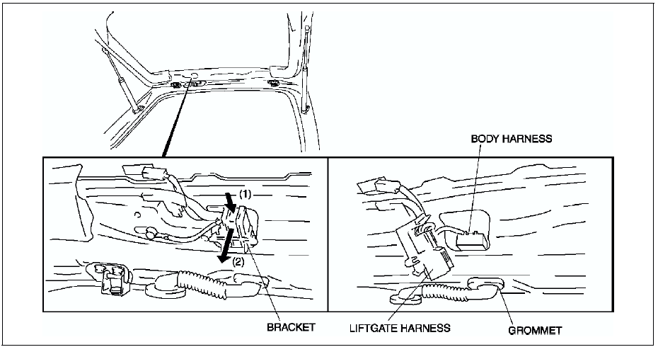 4. Disconnect the vehicle harness connector and the liftgate connector. Then remove the grommet from the liftgate.