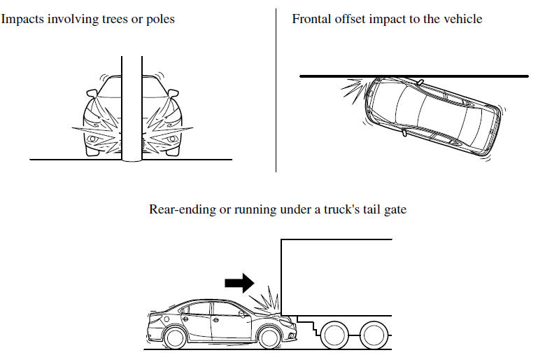 The following illustrations are examples of front/near front collisions that may not be detected as severe enough to deploy the SRS air bag equipment.