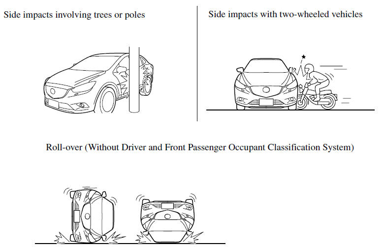 The following illustrations are examples of side collisions that may not be detected as severe enough to deploy the SRS air bag equipment.
