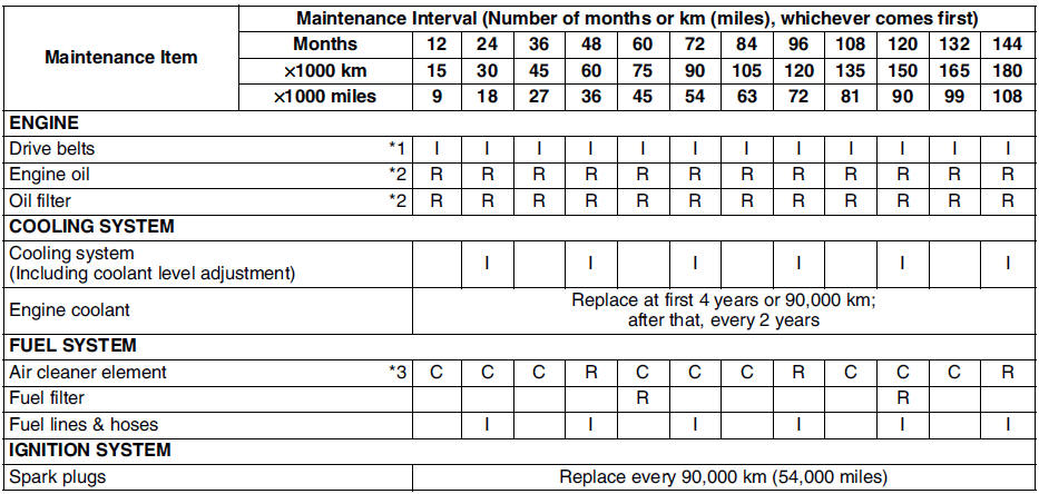 *3: If the vehicle is operated in very dusty or sandy areas, inspect and if necessary, clean or replace the air cleaner element more often than the recommended intervals.