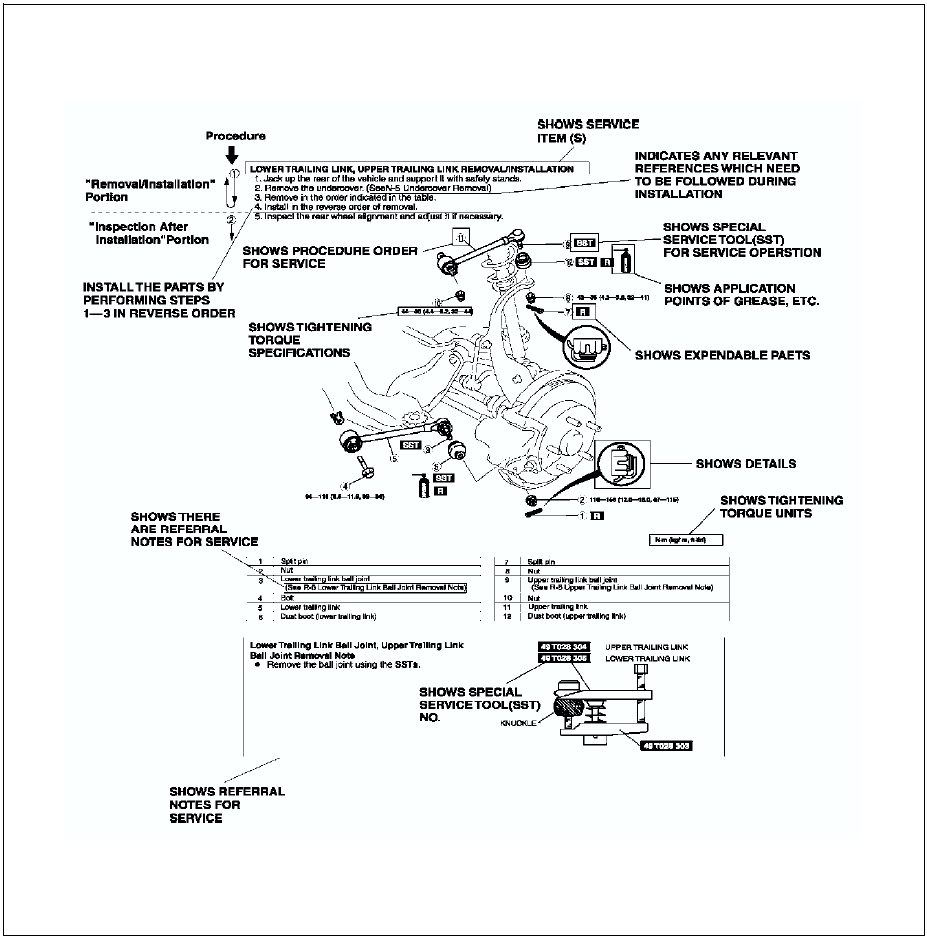 2. Expendable parts, tightening torques and symbols for oil, grease, and sealant are shown in the overview illustration. In addition, symbols indicating parts requiring the use of special service tools or equivalent are also shown.