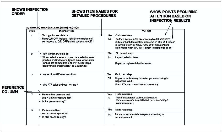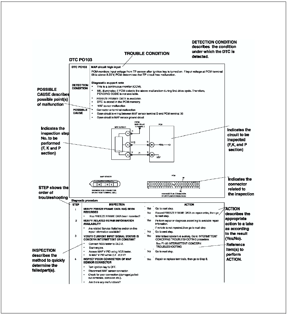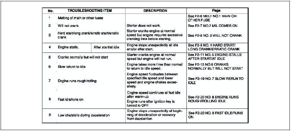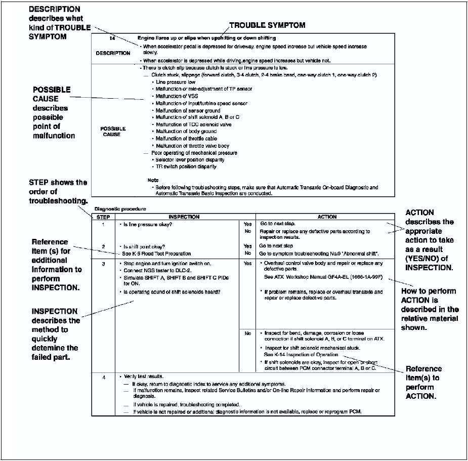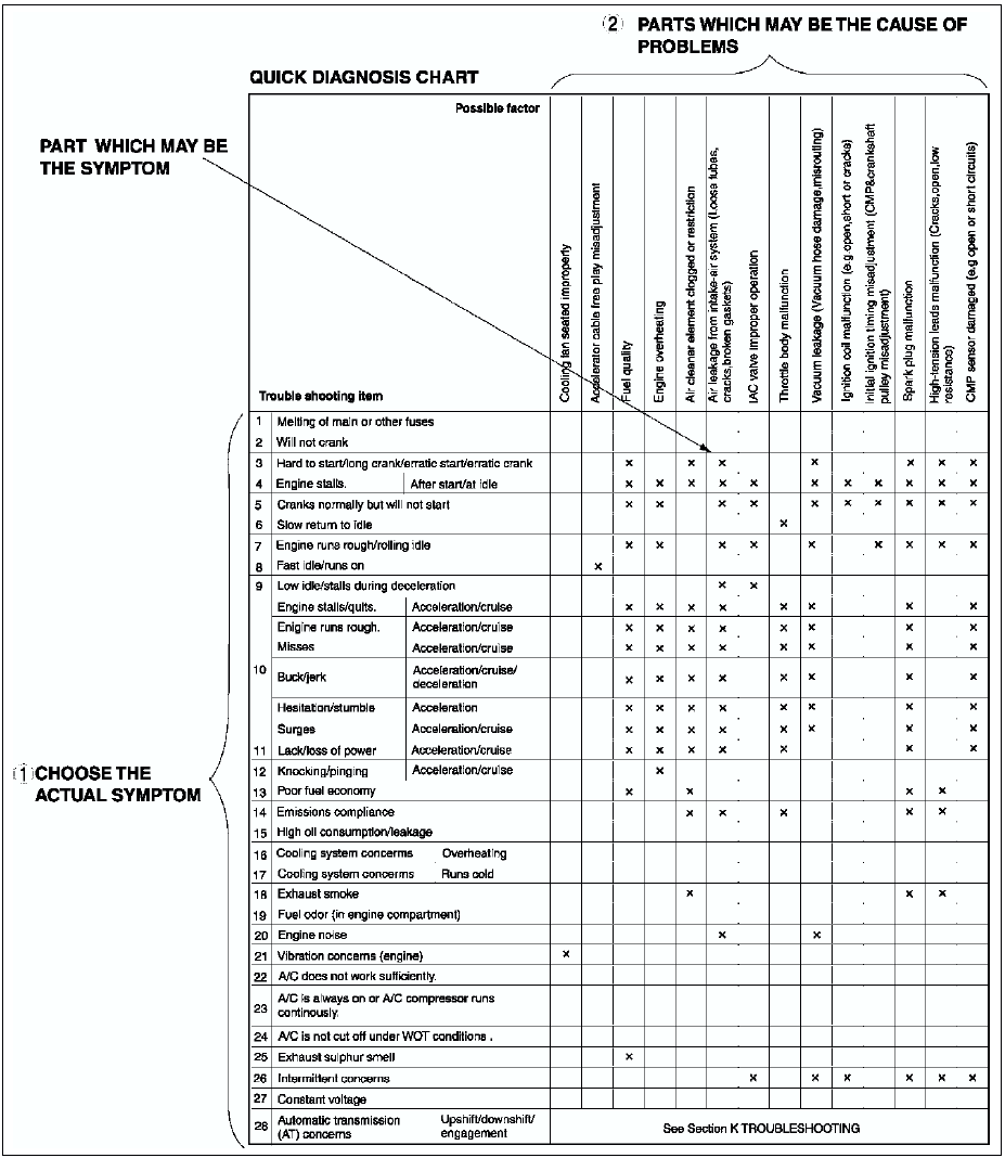 The quick diagnosis chart lists diagnosis and inspection procedures to be performed specifically relating to the cause of the malfunction.