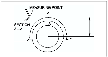6. Measure the height from the center of the wheel to the fender brim. The difference between the left and right measurement must not exceed 10 mm {0.39 in}.